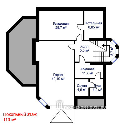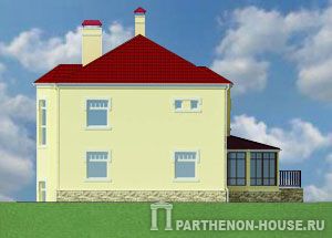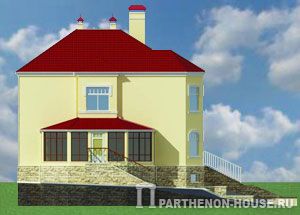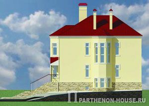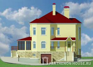 Этот коттедж особенно эффектно будет смотреться на участке со склоном. Цокольный этаж содержит гараж, кладовую, сауну с комнатой отдыха и холл. На первом этаже запроектированы кухня-столовая, гостиная с выходом на веранду, санузел. Второй этаж – приватная зона. Там располагаются четыре спальни, ванная комната и гардеробные. Максимальное количество жильцов: 7 человек.