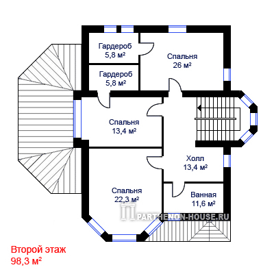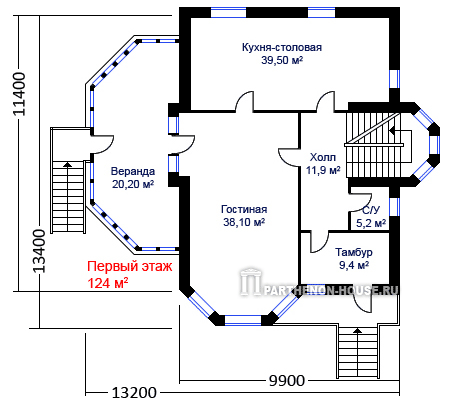 Габаритные размеры дома: 13,20 х 13,40 м.