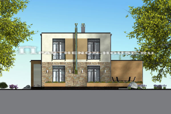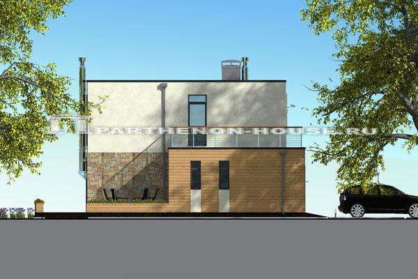 Двухэтажный дом в стиле "модерн". Главные привлекательные особенности данного дома, это гараж для парковки одного автомобиля, а также блок спальни хозяев дома с приватным санузлом и выходом на балкон второго этажа. Дом для семьи из четырех человек. Есть несколько вариантов этого дома.