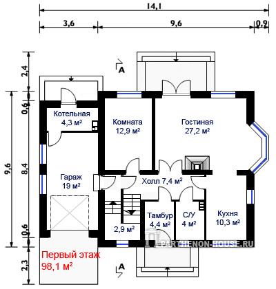 Габаритные размеры дома: 14,1 х 9,6 х 8,60 м.