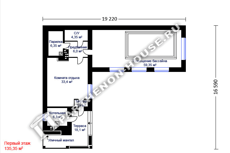 Габаритные размеры бани: 19,220 х 16,590 м.