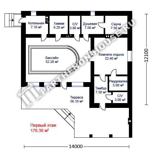 Габаритные размеры бани: 14,000 х 12,100 м. (в осях)