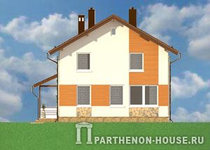 Проект компактного загородного двухэтажного дома с пристроенным навесом для парковки автомобиля. Данный дом подходит для небольших или узких загородных участков строительства.