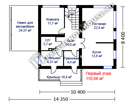 Габаритные размеры дома: 10,400 х 8,400 м. (в осях, без крыльца и навеса для авто)