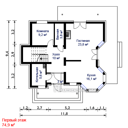 Габаритные размеры дома: 11,8 х 9,4 х 7,90 м.